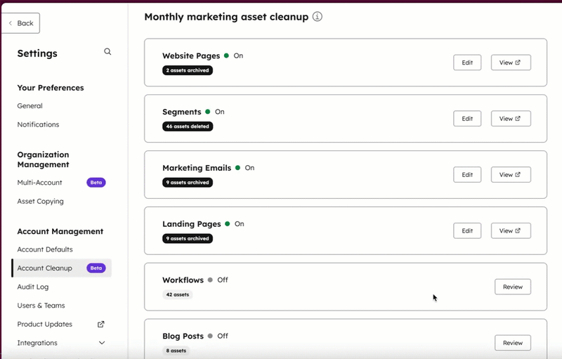 Les emails et pages en brouillon peuvent être archivés. Les segments et workflows non utilisés peuvent être supprimés, tout en restant restaurables pendant une période déterminée.